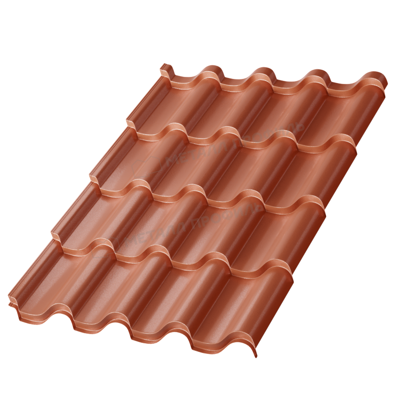 Профиль формирует волнообразную структуру, напоминающую традиционную керамическую черепицу. Высота волны 25 мм, шаг 350 мм, что обеспечивает оптимальную жесткость и эстетичный вид. Изготовлен из оцинкованной стали толщиной 0,5 мм, что балансирует между прочностью и легкостью монтажа.